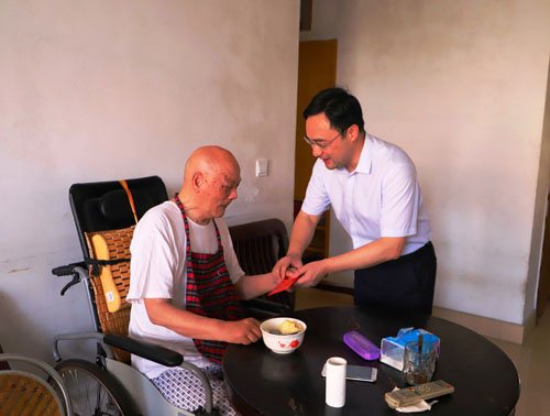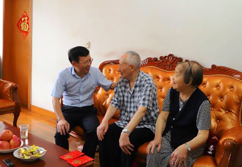 在郑熹、张庆云两位党龄分别达70和67周年的老党员家中,李恭进拉着老人的手,向他们表示敬意,详细询问家庭、生活、身体和医疗保障等情况,耐心倾听他们的意见建议,并送上慰问金。二老对学校推进落实“五大工程”、书记带头上思政课等决策部署表示高度赞赏,对学校取得全国大学生临床技能大赛一等奖的成绩感到由衷地高兴。看到两位老人家庭和睦、相扶相依,李恭进感到十分欣慰。他说:“感谢你们为党的事业作出的贡献,对赣医发展给予的关心。您作为学校最年长的党支部书记,在离退休党员干部中有着很高的威望,希望能继续发挥余热,为学校发展出主意、献良策。祝愿你们阖家幸福、健康长寿。”李恭进还走访慰问了老党员、困难党员代表陈文明。
