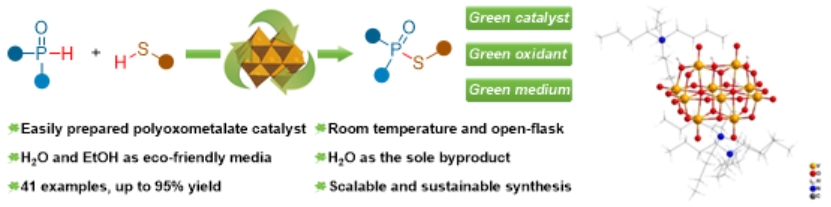 研究团队开发了一种基于多酸(POM)催化的P(O)−H/S−H交叉脱氢偶联新策略。该方法创新性地采用十钒酸阴离子作为催化剂,以空气为氧化剂,在水或乙醇等绿色介质中,于室温条件下成功实现了硫酚/醇与P(O)−H化合物的高效偶联。整个反应过程无需依赖热、光、电等外部能量输入,也不涉及任何有害化学助剂的使用,且在克级规模合成中还表现出优异的可循环使用性充分体现了绿色化学的原子经济性和环境友好性特征。