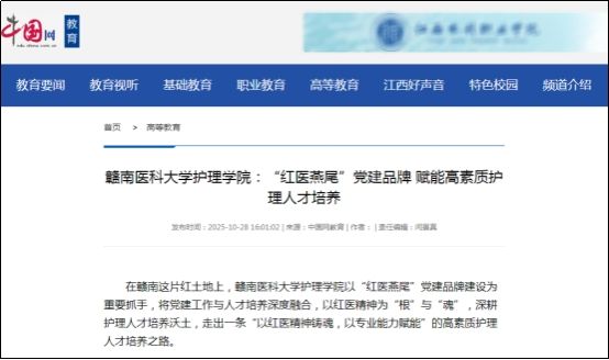 在赣南这片红土地上,赣南医科大学护理学院以“红医燕尾”党建品牌建设为重要抓手,将党建工作与人才培养深度融合,以红医精神为“根”与“魂”,深耕护理人才培养沃土,走出一条“以红医精神铸魂,以专业能力赋能”的高素质护理人才培养之路。