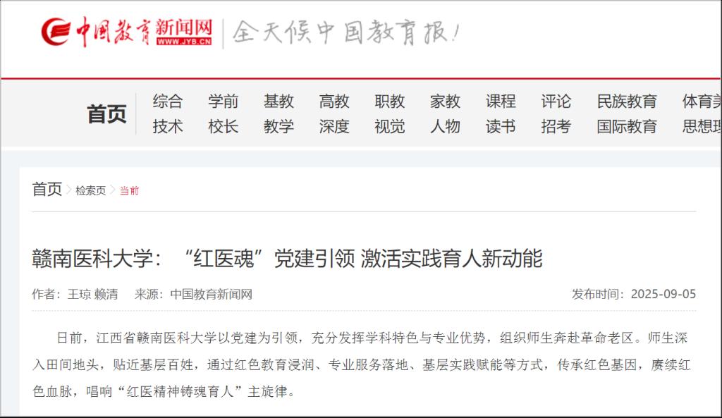 近年来,赣南医科大学始终坚持党建引领,深入挖掘红色资源、大力传承红色基因、积极赓续红医血脉,持续擦亮“红医魂”党建育人品牌,以红医精神铸魂育人,推动党建与业务深度融合,以高质量党建引领高质量发展,落实立德树人根本任务,为社会培养更多德技双馨的高素质医学人才。