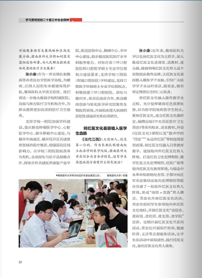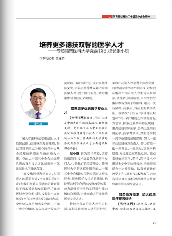 近日,学校党委书记、校长张小康就学习贯彻党的二十届三中全会精神,培养更多德技双馨的医学人才、办好人民满意的教育接受中共江西省委机关刊物《当代江西》杂志专访,2024年《当代江西》杂志第11期刊发了专访文章。