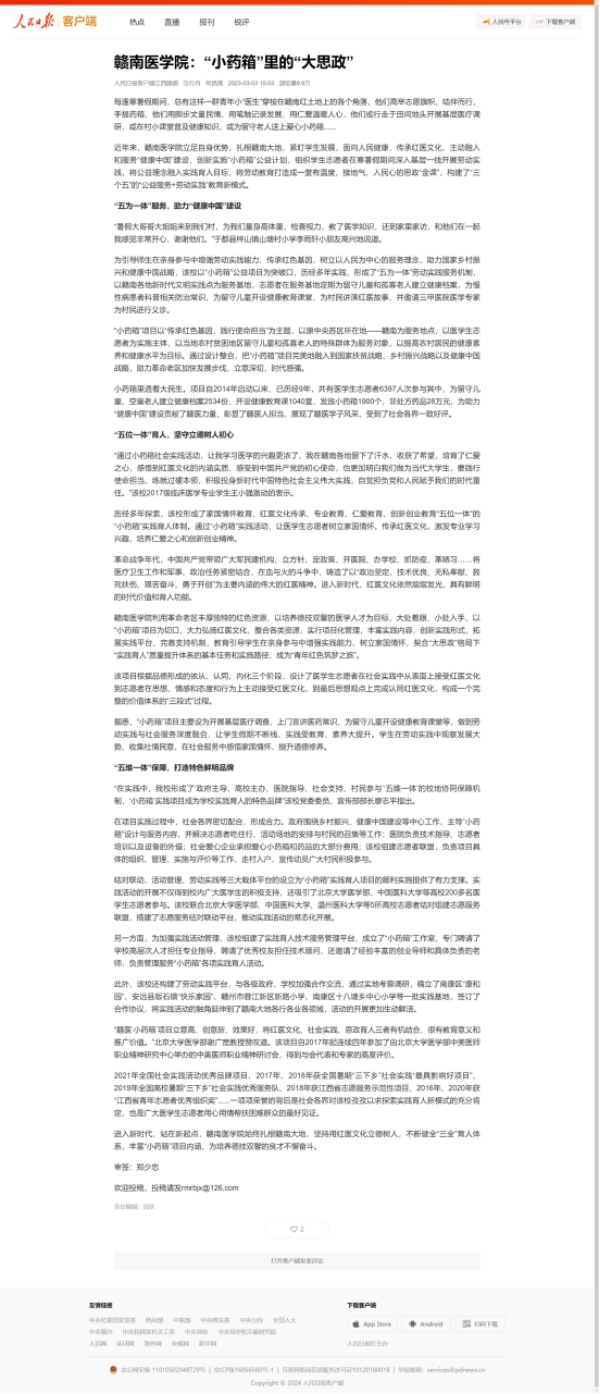 “在实践中,我校形成了‘政府主导、高校主办、医院指导、社会支持、村民参与’‘五维一体’的校地协同保障机制,‘小药箱’实践项目成为学校实践育人的特色品牌”该校党委委员、宣传部部长廖志平指出。
