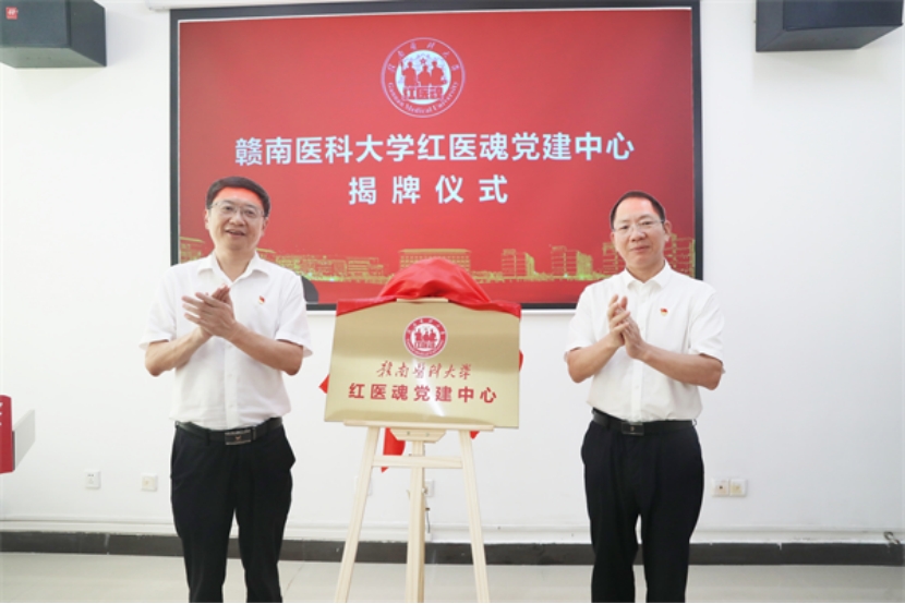 在全场热烈的掌声中,张小康、黄瑞忠共同为赣南医科大学红医魂党建中心揭牌。