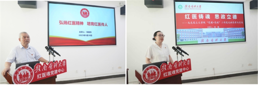 揭牌仪式后,中心举行了首场红医党课,苏区卫生与健康中国建设研究中心教授、著名的红医精神研究专家刘善玖以《弘扬红医精神 培育红医传人》为题,深情讲述了红医党建历史故事和红医精神在高校的传承与运用。马克思主义学院党委书记连璐以《红医铸魂、思政立德,马克思主义学院“党建 + 思政”工作范式的思考与实践》为题,分享了该校马克思主义学院在推进红医魂党建与思政教育深度融合、打造“红医马灯”党建特色品牌等方面的经验做法。