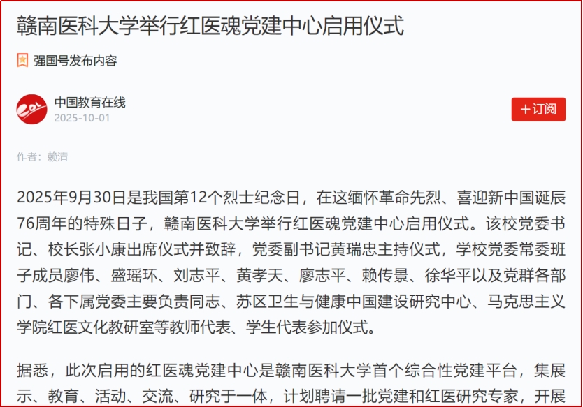 据悉,赣南医科大学自创建以来,始终扎根赣南红土地办学,坚持为党育人、为国育才的初心,肩负“服务人民健康、培养红色医生”使命,将红医精神融入教育教学、科学研究、医疗服务与社会实践全过程,形成了独具特色的办学传统与文化品格。此次红医魂党建中心的启用,不仅是学校党建工作的一件大事、喜事,更是传承红色基因、落实立德树人根本任务、培育时代新人的重要举措,标志着学校“红医魂”党建品牌创建迈入了新的阶段。