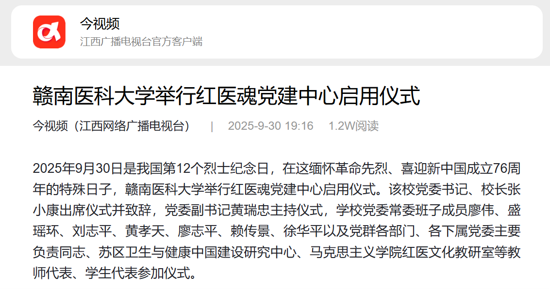 赣南医科大学举行红医魂党建中心启用仪式 - 今视频