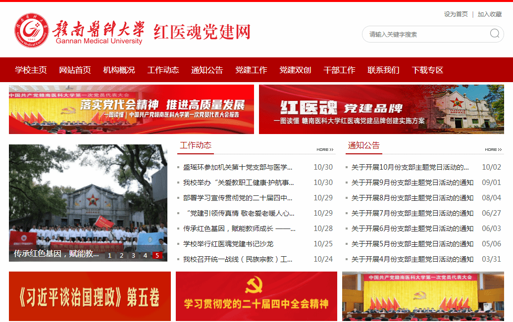 为加强党建网络阵地建设,学校精心打造了“赣南医科大学红医魂党建网站”,网址为:https://hyh.gmu.cn/,栏目主要包括工作动态、通知公告、基层党建、党建双创、干部工作、规则制度、下载专区等。